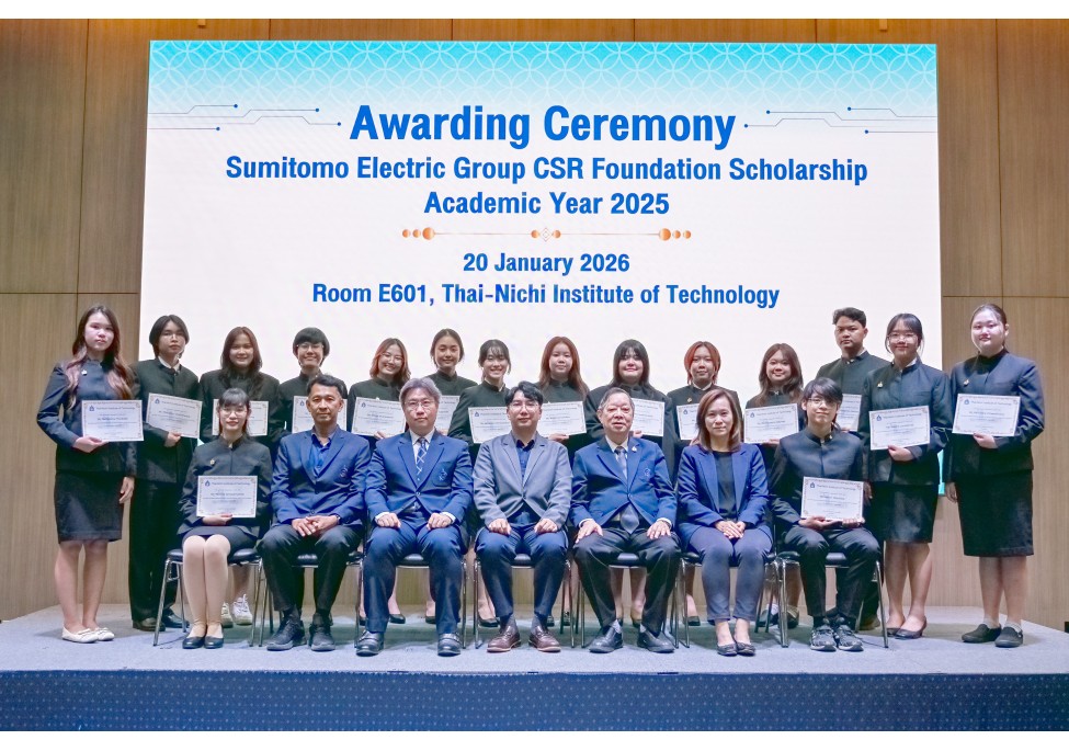 เมื่อวันที่ 20 มกราคม 2569 สถาบันเทคโนโลยีไทย-ญี่ปุ่น นำโดย รศ.รังสรรค์ เลิศในสัตย์ อธิการบดี พร้อมด้วยคณะผู้บริหารของสถาบัน ให้การต้อนรับ คุณธีรภัทร วิวัฒน์ธนาณัฐ ผู้ช่วยผู้จัดการฝ่ายทรัพยากรบุคคลและธุรการ (Assistant Manager Human Resources and General Affairs Department) จาก Sumitomo Electric Group CSR Foundation ในโอกาสเข้าร่วมพิธีมอบทุนการศึกษาแก่นักศึกษาของสถาบัน ในการนี้ Sumitomo Electric Group CSR Foundation ได้มอบทุนการศึกษาให้แก่นักศึกษาสถาบันเทคโนโลยีไทย-ญี่ปุ่น จำนวนทั้งสิ้น 17 คน เพื่อสนับสนุนโอกาสทางการศึกษาและส่งเสริมศักยภาพของนักศึกษาให้สามารถพัฒนาตนเองได้อย่างเต็มความสามารถ