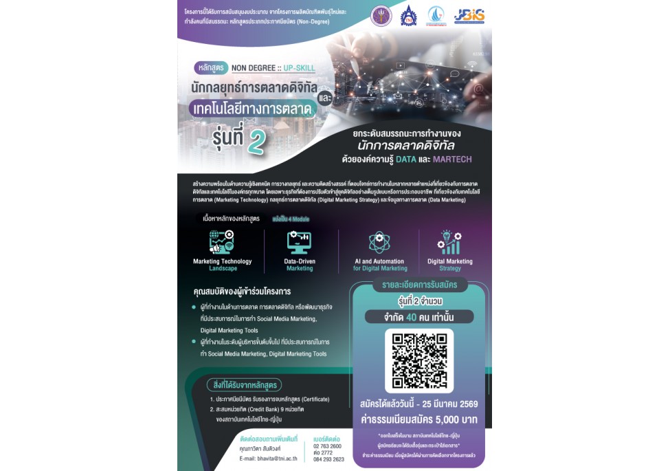 ยกระดับศักยภาพนักการตลาดด้วยการผสานพลังของ Data, AI และ Marketing Technology (MarTech) เพื่อเพิ่มความแม่นยำในการวิเคราะห์ลูกค้า วางกลยุทธ์อย่างมีประสิทธิภาพ และสร้างผลลัพธ์ทางธุรกิจที่วัดผลได้จริง หลักสูตรนี้ออกแบบมาเพื่อตอบโจทย์องค์กรและบุคคลที่ต้องการพัฒนาทักษะด้านการตลาดดิจิทัลเชิงลึกในยุค Data-Driven
