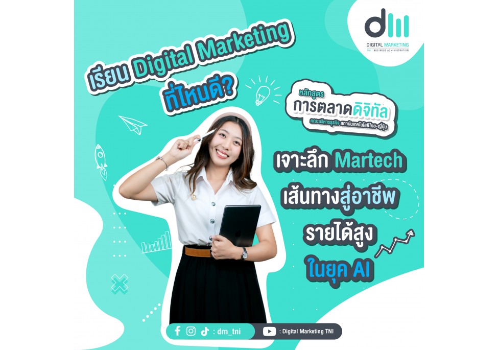 หากต้องการเรียนที่เน้นทั้ง Digital Marketing และ Martech หลักสูตรของคณะบริหารธุรกิจและเทคโนโลยีดิจิทัล สถาบันเทคโนโลยีไทย-ญี่ปุ่น (TNI) เป็นหนึ่งในตัวเลือกที่ตอบโจทย์ จุดเด่นของหลักสูตร ได้แก่ การเรียนควบคู่ระหว่างการตลาดและเทคโนโลยี การใช้ Data และ AI ในการเรียนจริง การฝึกทำงานและสร้างผลงานระหว่างเรียน การพัฒนาทักษะภาษาไทย อังกฤษ และญี่ปุ่น ครอบคลุมขนาดนี้ เรียนจบไปแล้ว บริษัทแย่งตัวกันน่าดู