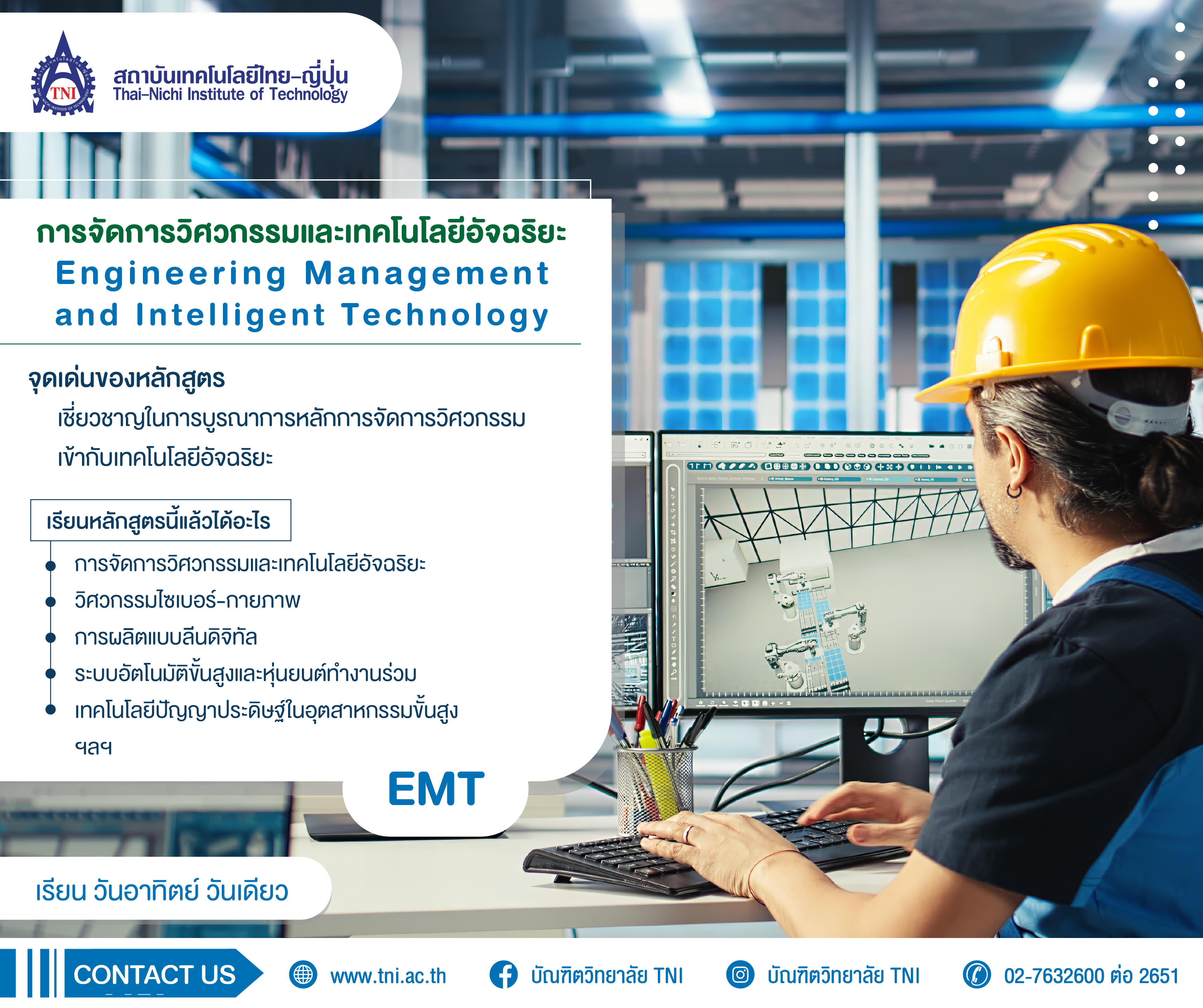 ก้าวข้ามขีดจำกัดด้านการบริหารจัดการสู่ยุคดิจิทัลกับหลักสูตร EMT ที่มุ่งปั้นมหาบัณฑิตให้เป็น "ผู้นำเทคโนโลยี" (Tech Leader) เราบูรณาการความแข็งแกร่งของ Engineering Management เข้ากับความอัจฉริยะของ Data Science และ AI ภายใต้ปรัชญา Monodzukuri แบบญี่ปุ่น