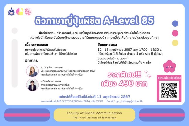 ใครจะสอบ A-Level 85 วิชาภาษาญี่ปุ่นบ้าง มาติวด้วยกันไหม—————————————–ติวภาษาญี่ปุ่นพิชิต A-Level 85 (ออนไลน์)ฝึกทำข้อสอบ สร้างความคุ้นเคย เข้าใจจุดที่ผิดพลาดเสริมความรู้และความมั่นใจในการสอบเริ่มเรียนวันที่ 12 – 15 พฤศจิกายน 2567 เวลา 17.00 – 18.30 น.(เรียนครั้งละ 1 ชั่วโมงครึ่ง จำนวน 4 ครั้ง รวม 6 ชั่วโมง)เนื้อหาการอบรมทบทวนคันจิ คำศัพท์ และไวยากรณ์ ผ่านการทำข้อสอบเช่น การผันคำกริยารูปต่างๆ วิธีการใช้คำช่วย วิทยากร 2 ท่านอ.ดร.สุวัฒนา แดงสุภาประธานหลักสูตรภาษาญี่ปุ่นเพื่อธุรกิจระหว่างประเทศ (JIB)คณะสื่อสารสากล สถาบันเทคโนโลยีไทย-ญี่ปุ่นอ.ภัทรารีย์ อมาตยกุลอาจารย์ประจำแผนกภาษาญี่ปุ่นคณะสื่อสารสากล สถาบันเทคโนโลยีไทย-ญี่ปุ่นราคาพิเศษ เพียง 490 บาท—————————————–สมัครเลยที่ https://training.tni.ac.th/public-training/245สมัครได้ตั้งแต่วันนี้ถึงวันที่ 11 พฤศจิกายน 2567—————————————–