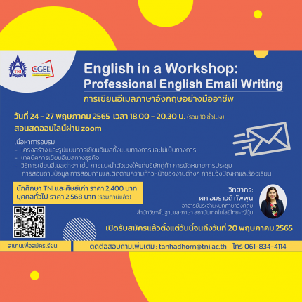 ขอเชิญเข้าร่วมอบรม Online Workshop หัวข้อ “การเขียนอีเมลภาษาอังกฤษอย่างมืออาชีพ” วันที่ 24 – 27 พฤษภาคม 2565 เวลา 18.00 – 20.30 น. (รวม 10 ชั่วโมง) เรียนเพียง 4 ครั้ง เนื้อหาแน่น – เรียนรู้โครงสร้าง และรูปแบบการเขียนอีเมลทั้งแบบทางการและไม่เป็นทางการ – เทคนิคการเขียนอีเมลทางธุรกิจ – วิธีการเขียนอีเมลต่างๆ เช่น การแนะนำตัวเองให้แก่บริษัทคู่ค้า การนัดหมายการประชุม การสอบถามข้อมูล การสอบถามและติดตามความก้าวหน้าของงานต่างๆ การแจ้งปัญหาและร้องเรียน นักศึกษา TNI และศิษย์เก่า ราคา 2,400 บาท บุคคลทั่วไป ราคา 2,568 บาท (รวมภาษีแล้ว) สมัครได้แล้วตั้งแต่วันนี้ที่ https://training.tni.ac.th/public-training/177