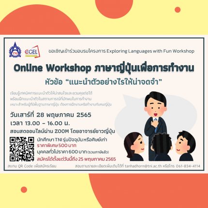 กลับมาอีกครั้งกับ Online Workshop ภาษาญี่ปุ่นเพื่อการทำงาน หัวข้อ “แนะนำตัวอย่างไรให้น่าจดจำ” ฝึกแนะนำตัวในสถานการณ์การทำงาน เหมาะกับผู้ที่มีพื้นฐานภาษาญี่ปุ่น และต้องการฝึกงานหรือทำงานกับคนญี่ปุ่น สอนโดยอาจารย์ชาวญี่ปุ่น วันเสาร์ที่ 28 พฤษภาคม 2565 เวลา 13.00 – 16.00 น. สอนสดออนไลน์ผ่าน ZOOM ค่าอบรม นักศึกษา TNI หรือศิษย์เก่า ราคา 500 บาท บุคคลทั่วไป ราคา 600 บาท สมัครได้ตั้งแต่วันนี้ถึงวันที่ 25 พฤษภาคม 2565 ที่ https://training.tni.ac.th/public-training/178