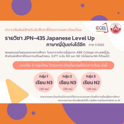 สำหรับนักศึกษา TNI ที่สนใจลงทะเบียนเรียนรายวิชา JPN-435 วิชาภาษาญี่ปุ่นเก่งได้อีก (Japanese Level Up) ภาค 1/2565 สามารถลงทะเบียนตามกลุ่มเรียนที่ต้องการเรียนได้ ดังนี้ หากต้องการเรียน N3 ให้ลงทะเบียนเรียนกลุ่ม 1 หรือกลุ่ม 2 หากต้องการเรียน N2 ให้ลงทะเบียนเรียนกลุ่ม 3 (รับนักศึกษากลุ่มละ 30 คน) วิชานี้สอนออนไลน์ตลอดภาคการศึกษา โดยอาจารย์ชาวญี่ปุ่นจาก ABK College สอนสดตรงจากประเทศญี่ปุ่น สอบถามรายละเอียดเพิ่มเติมได้ที่ อ.นันทิพร nuntiporn@tni.ac.th