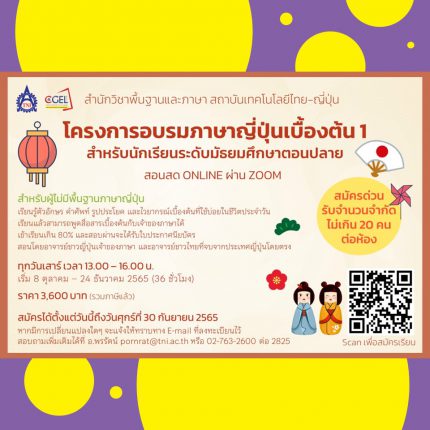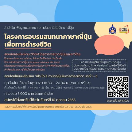 เปิดรับสมัครแล้ว โครงการอบรมสนทนาภาษาญี่ปุ่นเพื่อการดำรงชีวิต สอนสดออนไลน์ผ่าน zoom รอบเรียน : วันจันทร์และวันพุธ เวลาเรียน : 18.30 – 20.30 น. ระยะเวลาเรียน : 17 ตุลาคม – 26 ธันวาคม 2565 จำนวนชั่วโมงเรียน : 36 ชั่วโมง เหมาะสำหรับ ผู้ที่ไม่มีพื้นฐานภาษาญี่ปุ่น ผู้ที่ต้องการทำงาน ศึกษาต่อ หรือใช้ชีวิตที่ประเทศญี่ปุ่น ผู้ที่ต้องการท่องเที่ยวที่ประเทศญี่ปุ่น ผู้ที่สนใจอยากเริ่มเรียนภาษาญี่ปุ่น เนื้อหา ฝึกสนทนาในสถานการณ์ต่างๆ ที่มักพบในชีวิตประจำวันเบื้องต้น (เช่น การทักทาย การแนะนำตัว การสั่งอาหารและอ่านเมนูในร้านอาหาร) ฝึกอ่านตัวอักษรภาษาญี่ปุ่น (Hiragana Katakana และ Kanji) สอดแทรกวัฒนธรรมญี่ปุ่นที่จำเป็นต่อการดำรงชีวิตในประเทศญี่ปุ่น หนังสือเรียน อิโระโดะริ เบื้องต้น (บทที่ 1 – 6) สอนโดยอาจารย์ชาวไทยและอาจารย์ชาวญี่ปุ่น