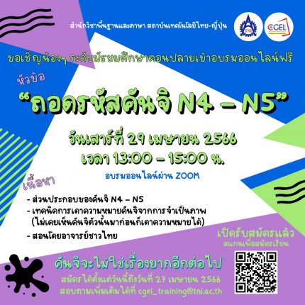 เรียนฟรี รับลมร้อน พิเศษเฉพาะนักเรียนระดับมัธยมศึกษาตอนปลายหรือเทียบเท่า . อบรมออนไลน์ฟรี หัวข้อ “ถอดรหัสคันจิ N4 – N5” มารู้จักส่วนประกอบของคันจิ N4 – N5 พร้อมเทคนิคการเดาความหมายคันจิจากการจำเป็นภาพ . ต่อให้ไม่เคยเห็นคันจิตัวนั้นมาก่อนก็เดาความหมายได้ รู้แล้ว คันจิจะไม่ใช่เรื่องยากอีกต่อไป . อบรมวันเสาร์ที่ 29 เมษายน 2566 เวลา 13:00 – 15:00 น. ผ่าน ZOOM สอนโดย อ.สุเพ็ญนภา บุญเพิ่ม อาจารย์ประจำแผนกภาษาญี่ปุ่น สำนักวิชาพื้นฐานและภาษา สถาบันเทคโนโลยีไทย-ญี่ปุ่น . สมัครเลยที่ https://forms.gle/erZtJFA52cuXC3t19 ตั้งแต่วันนี้ ถึงวันที่ 27 เมษายน 2566 . สอบถามเพิ่มเติมได้ที่ cgel_training@tni.ac.th