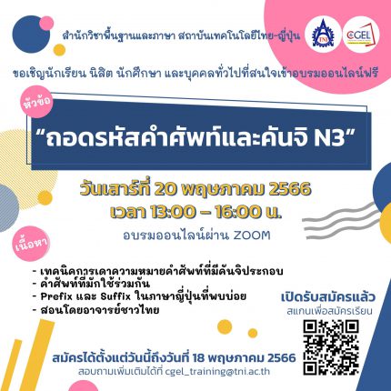 เรียนฟรี ท้าแดดให้แผดเผา . ขอเชิญชวนนักเรียน นิสิต นักศึกษา และบุคคลทั่วไปที่สนใจ อบรมออนไลน์ฟรี . หัวข้อ “ถอดรหัสคำศัพท์และคันจิ N3” . มาฝึกเทคนิคการเดาความหมายคำศัพท์ที่มีคันจิประกอบ เรียนรู้คำศัพท์ที่มักใช้ร่วมกัน Prefix และ Suffix ในภาษาญี่ปุ่นที่พบบ่อย . อบรมวันเสาร์ที่ 20 พฤษภาคม 2566 เวลา 13:00 – 16:00 น. ผ่าน ZOOM สอนโดย อ.ภัทรารีย์ อมาตยกุล อาจารย์ประจำแผนกภาษาญี่ปุ่น สำนักวิชาพื้นฐานและภาษา สถาบันเทคโนโลยีไทย-ญี่ปุ่น . สมัครเลยที่ https://forms.gle/vvFkKR7Z7BX7wmmY7 ตั้งแต่วันนี้ ถึงวันที่ 18 พฤษภาคม 2566