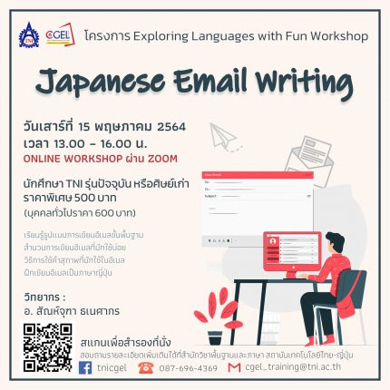 มา Upskill ภาษาญี่ปุ่นกันไหม ขอเชิญนักศึกษาและศิษย์เก่า TNI เข้าอบรม Online Workshop เพื่อพัฒนาทักษะภาษาญี่ปุ่นให้พร้อมสู่การทำงานหรือการฝึกงาน หัวข้อ การเขียนอีเมลภาษาญี่ปุ่น (Japanese Email Writing) วันเสาร์ที่ 15 พฤษภาคม 2564 เวลา 13.00 – 16.00 น. สอนสดออนไลน์ผ่าน zoom มาเรียนรู้เทคนิคการเขียนอีเมลภาษาญี่ปุ่น และฝึกเขียนอีเมล พร้อมรับคำแนะนำจากอาจารย์ผู้สอนอย่างใกล้ชิด สิทธิพิเศษสำหรับนักศึกษา TNI รุ่นปัจจุบันและศิษย์เก่า ลดเหลือ 500 บาท (บุคคลทั่วไปที่สนใจราคา 600 บาท) ลงชื่อสำรองที่นั่งก่อนใครได้ที่ https://bit.ly/33aHnAA (รับจำนวนจำกัด)