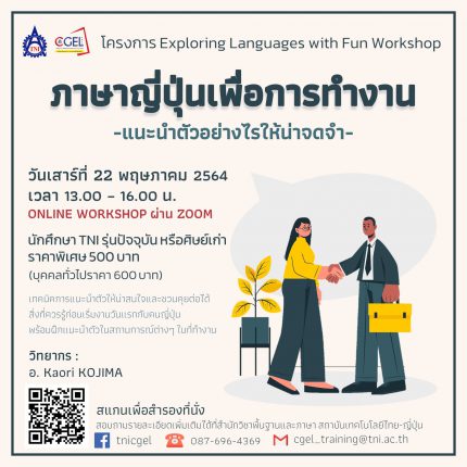 ตื่นเต้นกับการเริ่มงานวันแรก จะแนะนำตัวอย่างไรให้เพื่อนร่วมงานชาวญี่ปุ่นประทับใจ ลองมาฝึกซ้อมกับเรา Online Workshop ภาษาญี่ปุ่นเพื่อการทำงาน หัวข้อ แนะนำตัวอย่างไรให้น่าจดจำ อีกหนึ่ง workshop ที่ช่วยสร้างความมั่นใจในการสนทนาภาษาญี่ปุ่นในที่ทำงาน วันเสาร์ที่ 22 พฤษภาคม 2564 เวลา 13.00 – 16.00 น. สอนสดออนไลน์ผ่าน zoom เรียนรู้เทคนิคการแนะนำตัวให้น่าจดจำ และสิ่งที่ควรรู้ก่อนเริ่มงานกับชาวญี่ปุ่น พร้อมฝึกแนะนำตัวกับอาจารย์ชาวญี่ปุ่น สิทธิพิเศษสำหรับนักศึกษา TNI รุ่นปัจจุบันและศิษย์เก่า ลดเหลือ 500 บาท (บุคคลทั่วไปที่สนใจราคา 600 บาท) ลงชื่อสำรองที่นั่งก่อนใครได้ที่ https://bit.ly/3bdH647 (รับจำนวนจำกัด) เพราะการแนะนำตัวมีอะไรมากกว่าแค่การบอกชื่อ