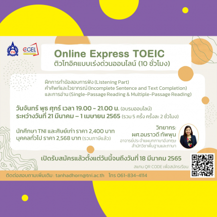 Online Express TOEIC ติวด่วนร้อนแรงรับซัมเมอร์ คอร์ส Online Express TOEIC ติวโทอิคแบบเร่งด่วนออนไลน์ ฝึกการทำข้อสอบการฟัง (Listening Part) คำศัพท์และไวยากรณ์ (Incomplete Sentence and Text Completion) และการอ่าน (Single-Passage Reading & Multiple-Passage Reading) เรียนวันจันทร์ พุธ ศุกร์ เวลา 19.00 – 21.00 น. (อบรมออนไลน์) ระหว่างวันที่ 21 มีนาคม – 1 เมษายน 2565 (รวม 5 ครั้ง ครั้งละ 2 ชั่วโมง) นักศึกษา TNI และศิษย์เก่า ราคา 2,400 บาท (แนบหลักฐานการเป็นนักศึกษาพร้อมสลิปการโอน) บุคคลทั่วไป ราคา […]