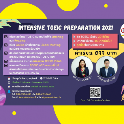 Intensive TOEIC Preparation 2021 อัพเดทล่าสุด!! โครงการ Intensive TOEIC Preparation 2021 จะขยายเวลารับสมัครออกไปจนถึงวันศุกร์ที่ 18 มีนาคม 2565 และเปลี่ยนแปลงวันเวลาเรียน จากเดิม 15 มีนาคม – 21 เมษายน 2565 เป็น 22 มีนาคม – 28 เมษายน 2565 นะครับ เรียนทุกวันอังคารและวันพฤหัสบดี เวลา 17.00 – 19.00 น. ผ่านทาง Zoom Meeting นักศึกษาที่สนใจอยากจะฝึกเทคนิคการทำข้อสอบ TOEIC เพื่อให้ได้คะแนนดี ๆ หรือเพื่อนำคะแนนมาใช้เทียบโอนในรายวิชาได้จนถึงรายวิชา ENL-212 ยังมีเวลาสมัครเพิ่มเติมอีก 1 สัปดาห์นะครับ ค่าสมัครเพียง 899 บาท เท่านั้น !! มาสมัครกันเยอะๆ เลยนะครับ