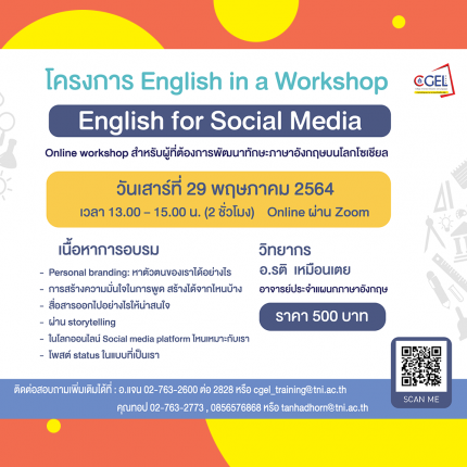 Online workshop สำหรับผู้ที่ต้องการพัฒนาทักษะภาษาอังกฤษบนโลกโซเชียล วันเสาร์ที่ 29 พฤษภาคม 2564 เวลา 13.00 – 15.00 น. (2 ชั่วโมง) Online ด้วยโปรแกรม Zoom บรรยายโดย อ.รติ เหมือนเตย อาจารย์ประจำแผนกภาษาอังกฤษ เนื้อหาการอบรม – Personal branding: หาตัวตนของเราได้อย่างไร – การสร้างความมั่นใจในการพูด สร้างได้จากไหนบ้าง – สื่อสารออกไปอย่างไรให้น่าสนใจ – ผ่าน storytelling – ในโลกออนไลน์ Social media platform ไหนเหมาะกับเรา – โพสต์ status ในแบบที่เป็นเรา ราคา 500 บาท เท่านั้น!!! สมัครเลย >>> https://training.tni.ac.th/public-training/148