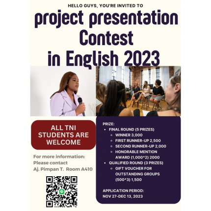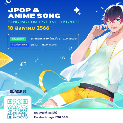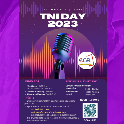 กลับมาแล้ววว กับการประกวด English SInging Contest ในงาน TNI Day 2023 ประกวดในวันศุกร์ที่ 18 สิงหาคม 66 :: สำหรับนักศึกษา TNI ที่สนใจเข้าร่วมประกวด :: สมัครได้ที่ bit.ly/46VSahL ภายในวันที่ 17 สิงหาคม 66 รับสมัครจำนวนจำกัด ! :: สำหรับนักศึกษา TNI ผู้ลงทะเบียนเรียนวิชา ENL-111 / ENL-211 และมาเข้าร่วมรับชมการประกวด :: อย่าลืม ! สแกน QR Code หน้างานกิจกรรม ถ่ายรูปหลักฐานว่าเข้าร่วมงาน และส่งรูปให้อาจารย์ผู้สอน จะได้รับคะแนนพิเศษ 2 คะแนน ! สอบถามเพิ่มเติมได้ที่ ผศ.อมราวดี ทัพพุน และ อ.กีรติ ทองซ้อนกลีบ ที่ห้อง A405