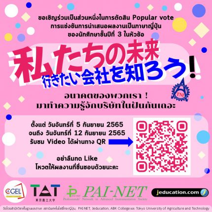ผลการแข่งขันการนำเสนอผลงานเป็นภาษาญี่ปุ่นของนักศึกษา JPN ชั้นปีที่ 3 จัดขึ้นโดย สำนักวิชาพื้นฐานและภาษา สถาบันเทคโนโลยีไทย-ญี่ปุ่น, องค์กร PAI-NET, ABK College, J Education และ Tokyo University of Agriculture and Technology (東京農工大学) 💞😚 โดยตัวแทนจากแต่ละกลุ่มเรียนนำเสนอในหัวข้อ 私たちの未来、行きたい会社を知ろう!อนาคตของพวกเรา ! มาทำความรู้จักบริษัทในฝันกันเถอะ รางวัลชนะเลิศอันดับที่ 1 (Winner/優勝) รับเงินรางวัลมูลค่า 7,000 บาท จากองค์กร PAI-NET พร้อมประกาศนียบัตร นักศึกษาจากคณะวิศวกรรมศาสตร์ นายคชภพ คำภิรมย์, นายอิศริยะ จันทร์ศิริ และ นายวรินทร เพ่งวรรธนะ รางวัลรองชนะเลิศอันดับที่ 1 (The runner up/準優勝) รับเงินรางวัลมูลค่า 5,000 บาท จากองค์กร PAI-NET พร้อมประกาศนียบัตร นักศึกษาจากคณะเทคโนโลยีสารสนเทศ นายณัฐดนัย คำเจริญ […]