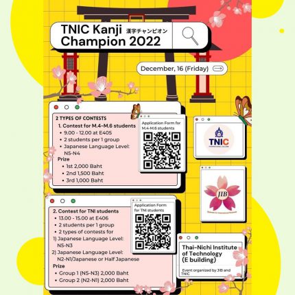 Are you readyyyy? มาแล้วค่าาาาา กิจกรรมการแข่งขันตัวอักษรคันจิ ในโครงการ Kanji Champion 2022 วันศุกร์ที่ 16 ธันวาคม 2565 เปิดรับสมัครสำหรับนักเรียน ม.4-ม.6 https://docs.google.com/…/1FAIpQLScxxLjh60UO20…/viewform และนักศึกษา TNI https://docs.google.com/…/1FAIpQLSe9UNs1…/formrestricted หรือสแกน QR Code ได้เล้ยยย มาสมัครกันเยอะ ๆ นะคะ แอบกระซิบว่ามีเงินรางวัลให้ด้วยค่ะ