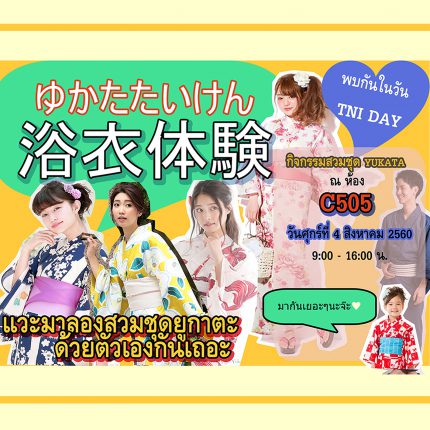 ประชาสัมพันธ์กิจกรรมแต่งชุดยูกาตะ วันครบรอบการก่อตั้งสถาบัน เนื่องในวันคล้ายวันก่อตั้งสถาบันเทคโนโลยีไทย-ญี่ปุ่น (TNI Day) ทางสำนักวิชาพื้นฐานและภาษาได้จัดกิจกรรม YUKATA TAIKEN ขึ้น ให้ผู้ที่สนใจสามารถเข้าร่วมกิจกรรม มาลองแต่งกายด้วยชุดยูกาตะด้วยตนเอง ในวันศุกร์ ที่ 4 สิงหาคม 2560 ณ ห้อง C505 ตั้งแต่เวลา 9:00 – 16:00 น. โดยจะจัดเป็นรอบๆ ตามเวลา ได้แก่ 9:00 น. 10:00 น. 13:00 น. 14:00 น. และ 15:00 น. ในหนึ่งรอบจะใช้เวลาสาธิตและลองใส่ชุดยูกาตะประมาณ 1 ชม. และนอกเหนือจากนี้ ในวันดังกล่าว ยังมีกิจกรรมอื่นๆ จากทางสำนักวิชาพื้นฐานและภาษา และ กิจกรรมจากนักศึกษา อีกมากมาย แล้วพบกันนะคะ