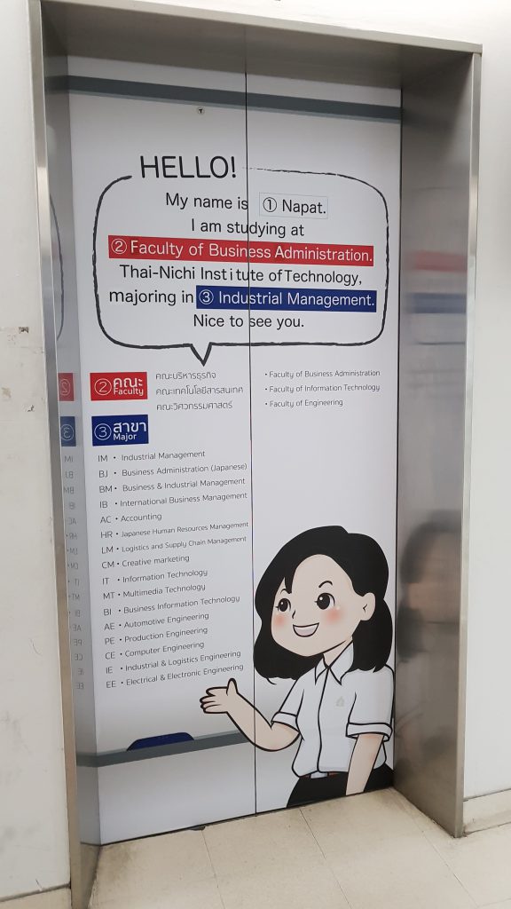 สำนักวิชาพื้นฐานและภาษา สถาบันเทคโนโลยีไทย-ญี่ปุ่น(CGEL ) จัดโครงการ Lift up with CGEL ขึ้นโดยได้จัดทำสติกเกอร์ให้ความรู้ภาษาญี่ปุ่นและภาษาอังกฤษ ติดยังหน้าลิฟท์ มีวัตถุประสงค์เพื่อให้นักศึกษาตระหนักถึงและมีทัศนคติที่ดีต่อภาษาญี่ปุ่นและภาษาอังกฤษ สามารถสังเกตุและจดจำคำศัพท์หรือสำนวน นำมาใช้ในชีวิตประจำวันได้ เริ่มดำเนินการติดตั้งมาตั้งแต่เดือนธันวาคมค่ะ