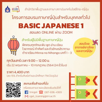 ข่าวดีสำหรับผู้ที่อยากเริ่มเรียนภาษาญี่ปุ่น สำนักวิชาพื้นฐานและภาษา สถาบันเทคโนโลยีไทย-ญี่ปุ่น จัดอบรมภาษาญี่ปุ่นในโครงการ Basic Japanese 1 สำหรับผู้ไม่มีพื้นฐานภาษาญี่ปุ่น ในรูปแบบออนไลน์ผ่าน ZOOM รอบเรียนวันเสาร์ เวลา 9.00 – 12.00 น. เริ่มเรียนวันที่ 22 พ.ค. – 10 ก.ค. 2564 (เรียนครั้งละ 3 ชั่วโมง จำนวน 8 ครั้ง รวม 24 ชั่วโมง) เน้นทุกทักษะฟัง พูด อ่าน เขียน เรียนไวยากรณ์ คำศัพท์ภาษาญี่ปุ่นชั้นต้น ฝึกอ่านเขียนตัวอักษรฮิรากานะ ฝึกสนทนาในชีวิตประจำวันกับอาจารย์ชาวญี่ปุ่น สอนโดยอาจารย์ชาวไทยและชาวญี่ปุ่น ราคา 4,400 บาท (ลด 15% สำหรับศิษย์เก่าและนักศึกษา TNI ปัจจุบัน) เปิดรับสมัครตั้งแต่วันนี้ – 18 พฤษภาคม 2564 ลงชื่อสำรองที่นั่งได้ที่ http://bit.ly/basicJP1 […]