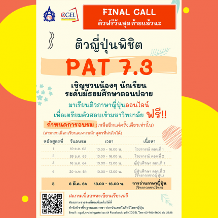 FINAL CALL เรียนฟรีวันสุดท้ายแล้วนะ คอร์สเรียนออนไลน์ “ติวญี่ปุ่นพิชิต PAT 7.3 หัวข้อการอ่านภาษาญี่ปุ่น” ฟรี!!! สำหรับน้องๆ นักเรียนระดับมัธยมศึกษาตอนปลาย วันเสาร์ที่ 6 มีนาคม 2564 เวลา 13.00 – 16.00 น. ผ่าน ZOOM – มารู้จักข้อสอบการอ่าน – ฝึกเทคนิคการทำข้อสอบการอ่าน – ทบทวนคำศัพท์ ไวยากรณ์ และคันจิ ผ่านการทำข้อสอบ ลงทะเบียนเรียน เพื่อรอรับรหัสเข้าห้องเรียนได้ที่ http://bit.ly/PAT732nd (ปิดรับสมัครวันเสาร์ที่ 6 มีนาคม 2564 เวลา 12.00 น.) (หลังจากลงทะเบียนแล้ว เจ้าหน้าที่จะส่งรหัสเข้าห้องเรียนให้ทางอีเมลล่วงหน้า 1 วันก่อนการอบรมในแต่ละรอบ และสำหรับน้องๆ ที่เคยลงทะเบียนไว้แล้วก่อนหน้านี้ ไม่จำเป็นต้องลงซ้ำค่ะ)