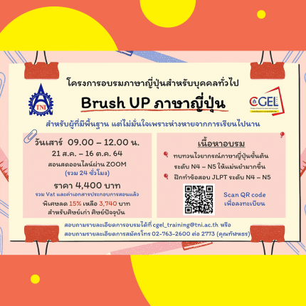สำหรับผู้ที่เคยเรียนภาษาญี่ปุ่นมาก่อน แต่ไม่ค่อยได้ใช้หรือห่างหายจากการเรียนไปนาน พื้นฐานไม่แน่น หรือไม่มั่นใจ อยากทบทวนความรู้ภาษาญี่ปุ่นชั้นต้น ระดับ N4 – N5 มาเรียนทบทวนด้วยกันกับโครงการ Brush Up ภาษาญี่ปุ่น ที่จะช่วยปัดฝุ่นความรู้ภาษาญี่ปุ่นชั้นต้นให้คุณ เรียนทุกวันเสาร์ เวลา 9.00 – 12.00 น. เริ่ม 21 สิงหาคม – 16 ตุลาคม 2564 รวม 24 ชั่วโมง ราคา 4,400 บาท พิเศษลด 15% สำหรับนักศึกษา TNI ปัจจุบันหรือศิษย์เก่า เหลือเพียง 3,740 บาท สมัครได้ตั้งแต่วันนี้ ถึงวันที่ 14 สิงหาคม 2564 ที่ https://training.tni.ac.th/public-training/144 สอบถามรายละเอียดเพิ่มเติมได้ที่ cgel_training@tni.ac.th หรือ tanhadhorn@tni.ac.th มารื้อฟื้นความรู้ภาษาญี่ปุ่นด้วยกันนะคะ