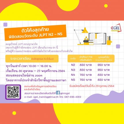 พร้อมหรือยังกับการสอบวัดระดับภาษาญี่ปุ่นที่กำลังใกล้เข้ามา มาติวด่วนก่อนสอบด้วยกันไหม “ติวโค้งสุดท้าย พิชิตสอบวัดระดับ JLPT N2 – N5” เน้นตะลุยโจทย์ ฝึกทำข้อสอบทุกพาร์ทอย่างจุใจ พร้อมมีอาจารย์อธิบายคำตอบไขทุกข้อสงสัย เหมาะกับผู้ที่กำลังจะสอบ JLPT เดือนธันวาคมนี้ และผู้ที่วางแผนว่าจะสอบ แต่ยังไม่แน่ใจว่าจะสอบระดับไหนดี มาตามหาระดับที่ใช่ด้วยกันนะ เรียนทุกวันเสาร์ เวลา 13.00 – 16.00 น. เริ่มเรียนวันที่ 30 ตุลาคม – 27 พฤศจิกายน 2564 เรียนเพียง 5 ครั้ง รวม 15 ชั่วโมง สอนสดออนไลน์ผ่าน zoom สมัครได้ที่ https://bit.ly/3FzuRMS ตั้งแต่วันนี้ถึงวันที่ 29 ตุลาคม 2564 สอบถามเพิ่มเติมได้ที่ cgel_training@tni.ac.th หรือ 087-696-4369