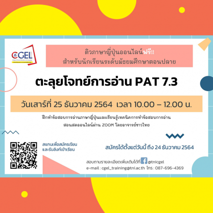 ของขวัญพิเศษส่งท้ายปีเก่าต้อนรับปีใหม่ สำหรับน้องๆ ระดับมัธยมศึกษาตอนปลายทุกคน ติวภาษาญี่ปุ่นออนไลน์ ฟรี!!! หัวข้อ “ตะลุยโจทย์การอ่าน PAT 7.3” วันเสาร์ที่ 25 ธันวาคม 2564 เวลา 10.00 – 12.00 น. มาฝึกทำข้อสอบการอ่านและเรียนรู้เทคนิคการทำข้อสอบ สอนสดออนไลน์ผ่าน ZOOM โดยอาจารย์ชาวไทย สมัครได้แล้วตั้งแต่วันนี้ถึง 24 ธันวาคม 2564 ที่ https://forms.gle/G6LFMqzPwyuf5uJb7