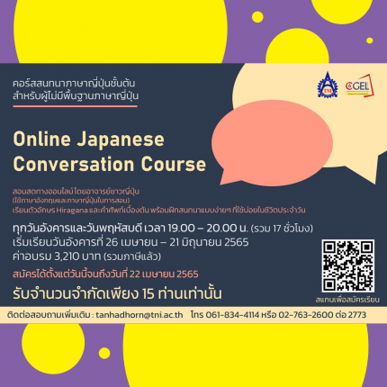 โอกาสดีสำหรับผู้ที่อยากเริ่มเรียนภาษาญี่ปุ่น โครงการอบรม Online Japanese Conversation Course เรียนสนทนากับอาจารย์ชาวญี่ปุ่น (สอนเป็นภาษาญี่ปุ่นและภาษาอังกฤษ) เสริมด้วยตัวอักษรฮิรากานะและคำศัพท์เบื้องต้น เหมาะกับผู้ที่ไม่เคยเรียนภาษาญี่ปุ่นมาก่อน ทุกวันอังคารและวันพฤหัสบดี เวลา 19.00 – 20.00 น. เริ่ม 26 เมษายน – 21 มิถุนายน 2565 ราคา 3,210 บาท (รวมภาษีแล้ว) (นักศึกษา TNI ราคา 3,000 บาท) รับเพียง 15 ท่านเท่านั้น!!! สมัครได้ตั้งแต่วันนี้ถึงวันที่ 22 เมษายน 2565 ที่ https://training.tni.ac.th/public-training/175