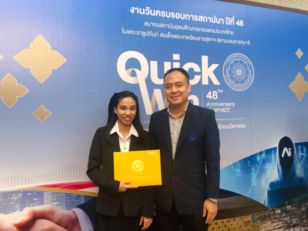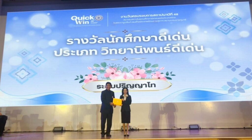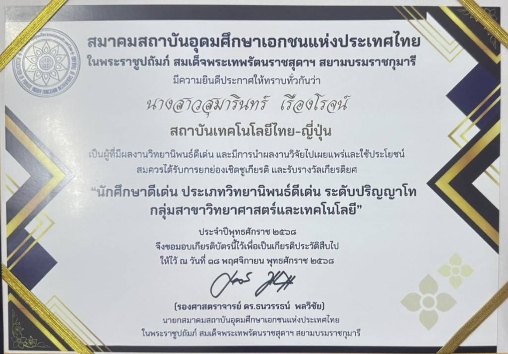 ที่ได้รับ รางวัลนักศึกษาดีเด่น ประเภทวิทยานิพนธ์ดีเด่น กลุ่มสาขาวิทยาศาสตร์และเทคโนโลยี ประจำปี 2568 จัดโดย สมาคมสถาบันอุดมศึกษาเอกชนแห่งประเทศไทย (สสอท.)