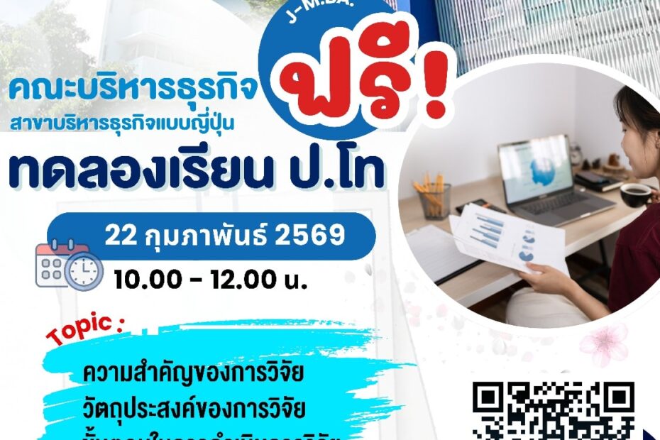 เปลี่ยนจาก “คนกลัววิจัย” เป็น “คนเข้าใจวิจัย” เหมาะกับคนที่อยากเรียนต่อ ป.โท ไม่เคยทำวิจัย ไม่ใช่ปัญหา แต่ไม่รู้ว่าจะเริ่มตรงไหน… นี่แหละปัญหาใหญ่! #กิจกรรมทดลองเรียน ความสำคัญของการวิจัย วัตถุประสงค์ต้องเขียนยังไง ขั้นตอนวิจัยแบบเข้าใจง่าย ฝึกกำหนดหัวข้อวิจัยของตัวเอง ทดลองเรียน ฟรี!!! ปริญญาโท หลักสูตรบริหารธุรกิจแบบญี่ปุ่น (J-M.BA.) เป็นหลักสูตรเดียวในประเทศไทย ลงทะเบียน https://forms.gle/eUhopkFwkdAPPtDg7 —————————— อย่ารอช้า!… Read More »ทดลองเรียน ฟรี!!! ปริญญาโท หลักสูตรบริหารธุรกิจแบบญี่ปุ่น (J-M.BA.)