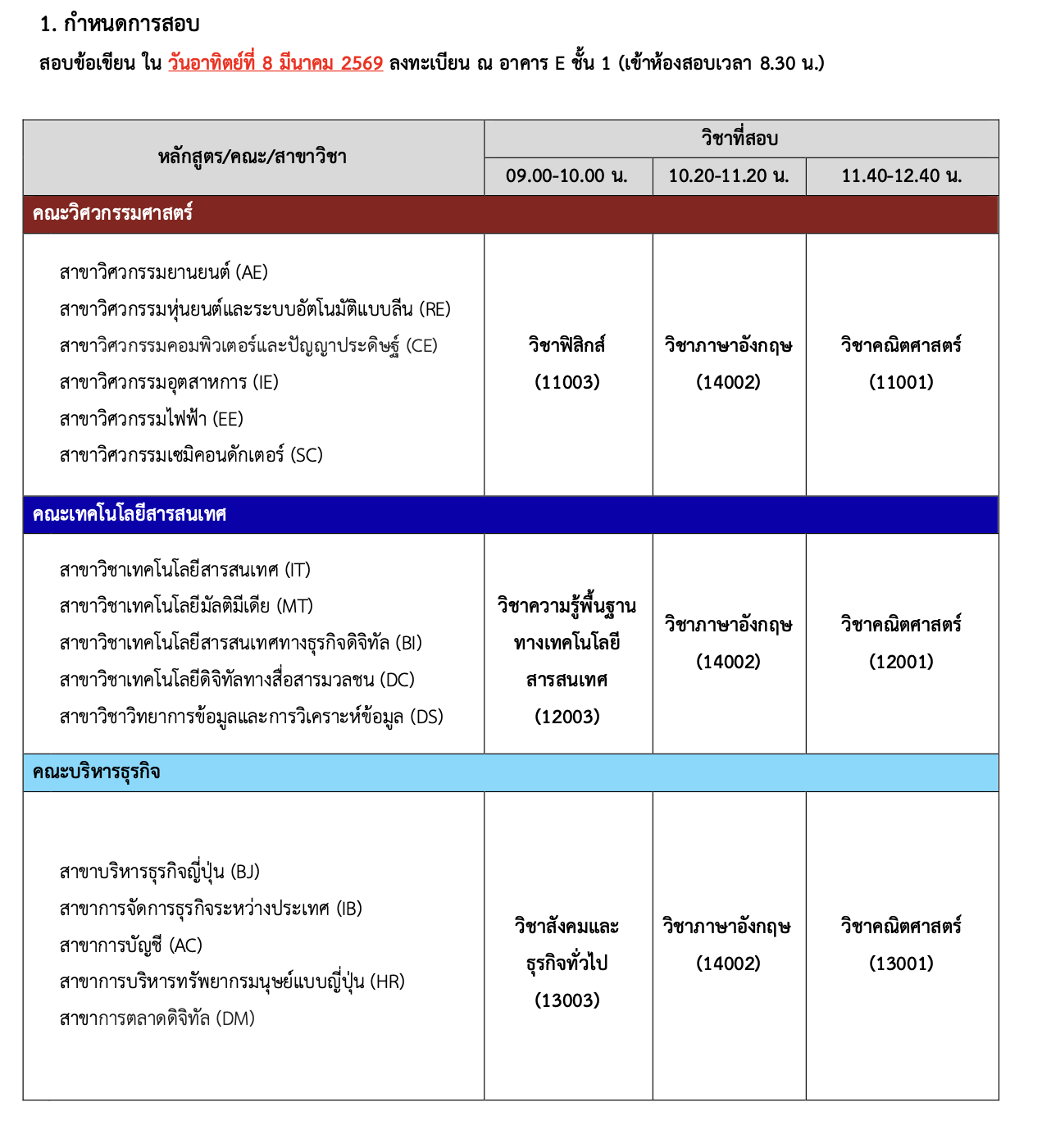 กำหนดการสอบข้อเขียน