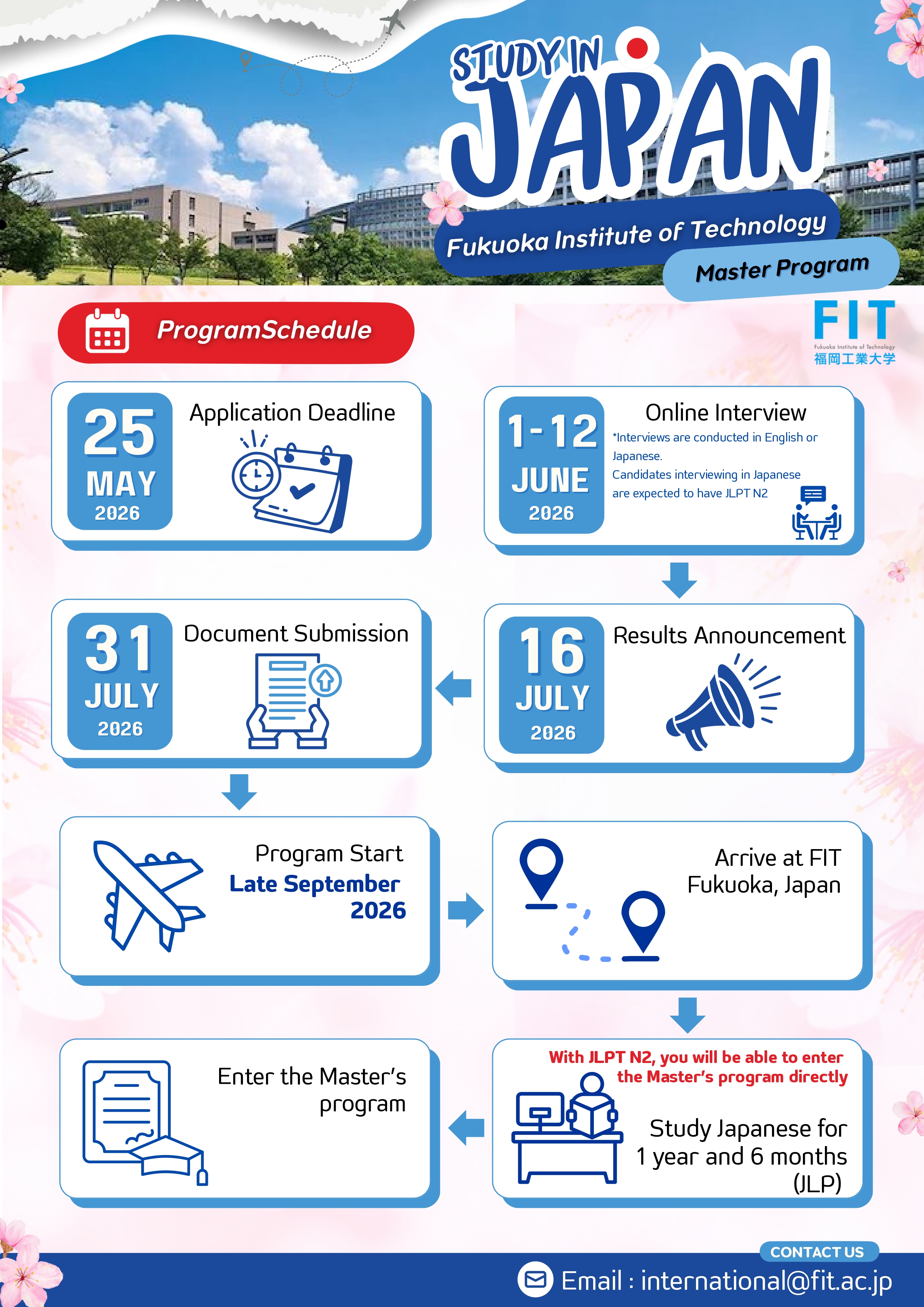 Fukuoka Institute of Technology (FIT) will be hosting a presentation to introduce their '4+2 Joint Program' and scholarships, specifically targeting 3rd and 4th-year TNI students interested in pursuing master's degree programs in Fukuoka, Japan!