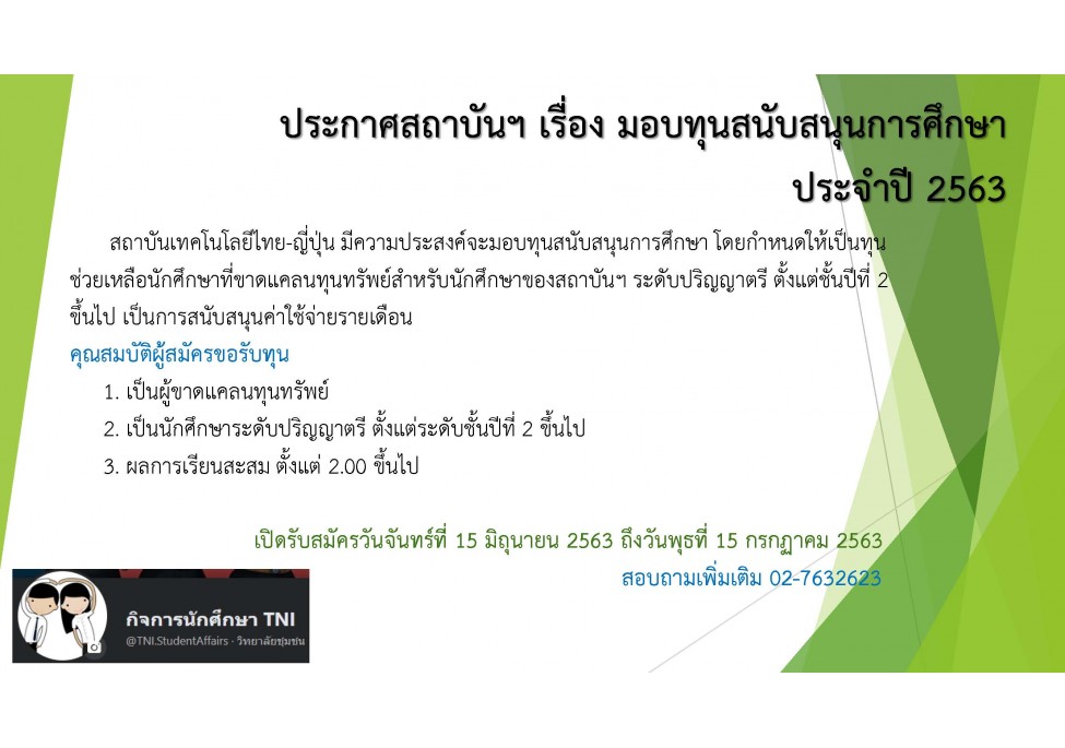 สอบถามได้ที่ฝ่ายกิจการนักศึกษา สถาบันเทคโนโลยีไทย-ญี่ปุ่น 02-763-2623 วันจันทร์-ศุกร์ เวลา 8.00-17.00 น.