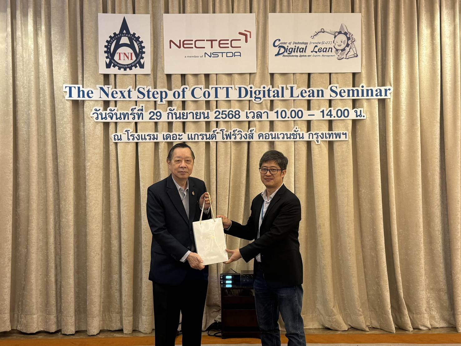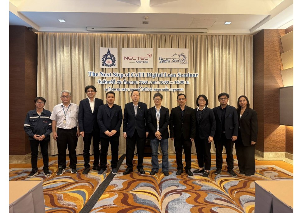 ศูนย์ความรู้และถ่ายทอดเทคโนโลยีเฉพาะด้านระบบการผลิตแบบลีนดิจิทัลและการจัดการโลจิสติกส์ ภายใต้ความร่วมมือระหว่าง ศูนย์เทคโนโลยีอิเล็กทรอนิกส์ และคอมพิวเตอร์แห่งชาติ (NECTEC) สำนักงานพัฒนาวิทยาศาสตร์และเทคโนโลยีแห่งชาติ (สวทช.) และสถาบันเทคโนโลยีไทย-ญี่ปุ่น (TNI: THAI-NICHI) จัดกิจกรรม “The Next Step of CoTT Digital Lean Seminar” ณ ห้อง Conference A ชั้น 3 โรงแรม Grand Fourwings ศรีนครินทร์