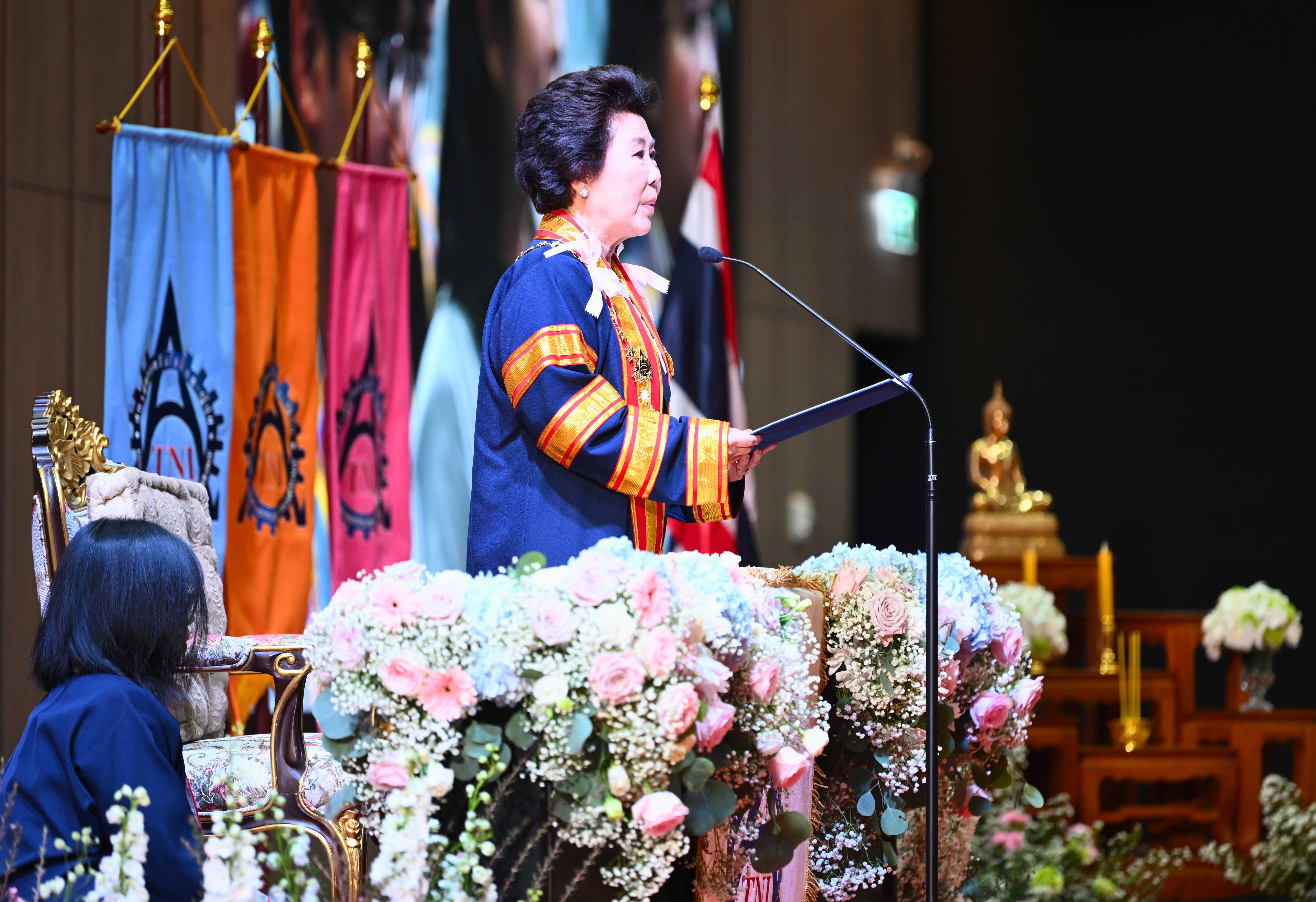 รองศาสตราจารย์ปราณี จงสุจริตธรรม อุปนายกสภาสถาบันเทคโนโลยีไทย-ญี่ปุ่น และนายกสมาคมส่งเสริมเทคโนโลยี (ไทย-ญี่ปุ่น) กล่าวให้โอวาท แก่บัณฑิตที่สำเร็จการศึกษาประจำปีการศึกษา 2567