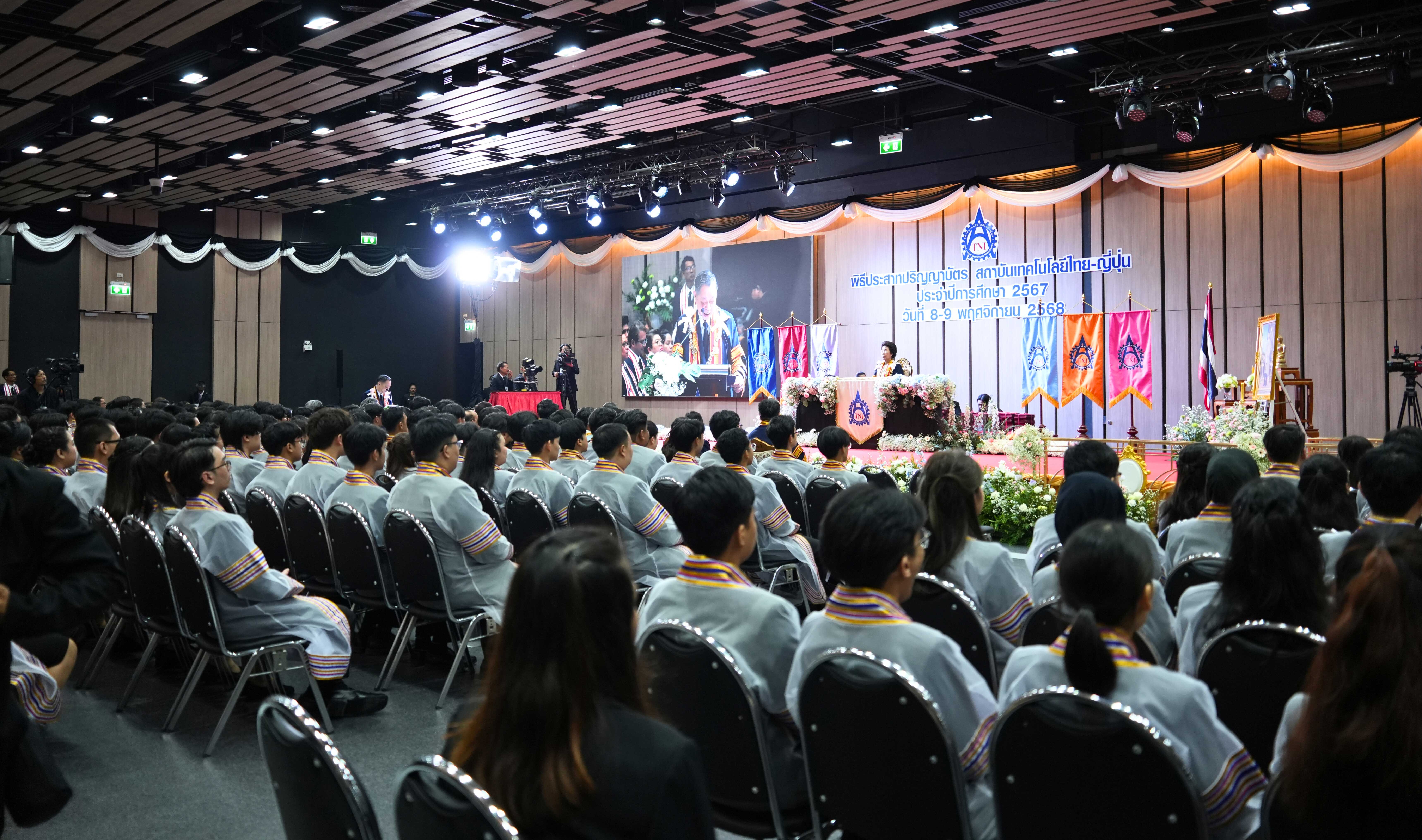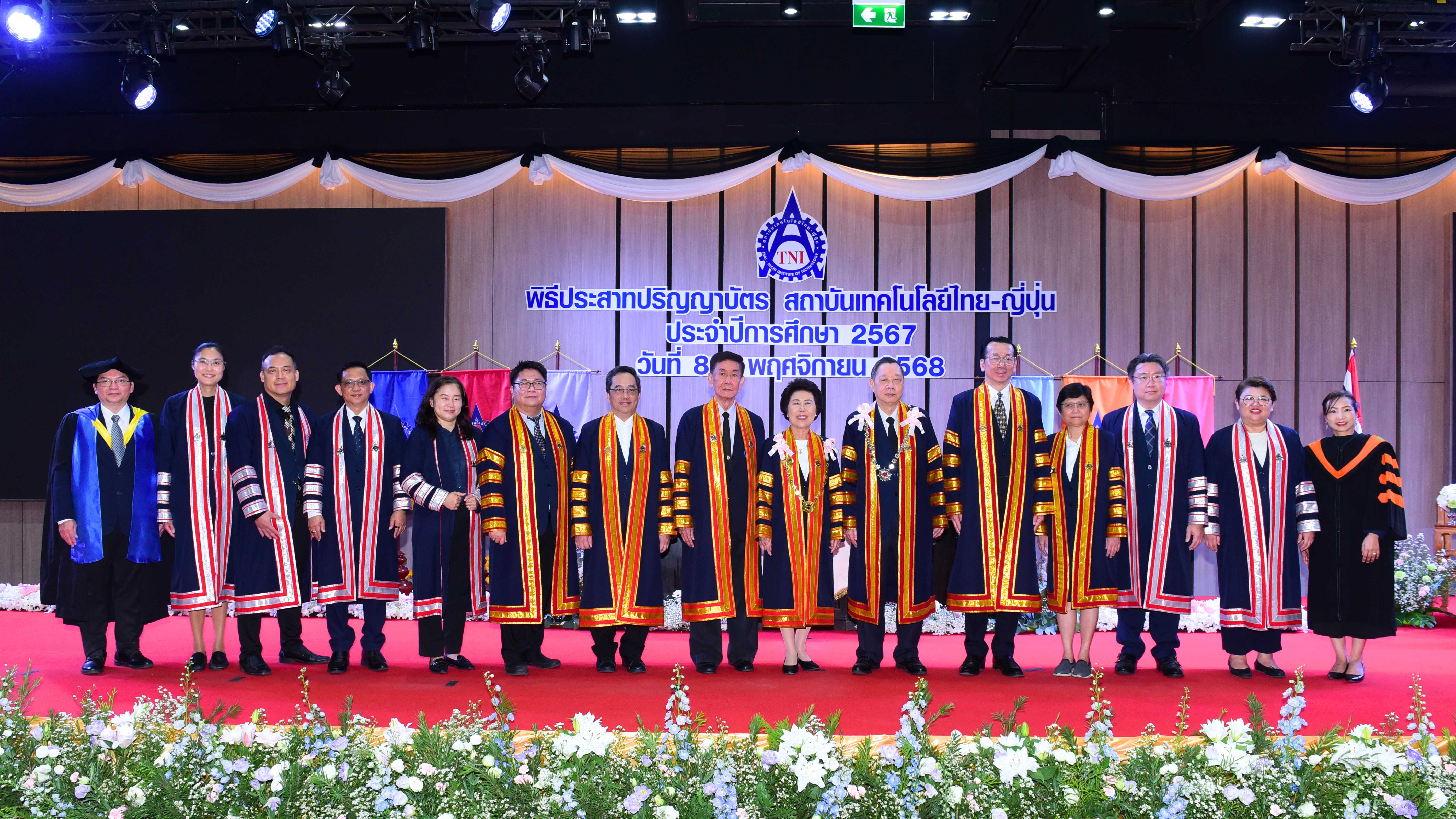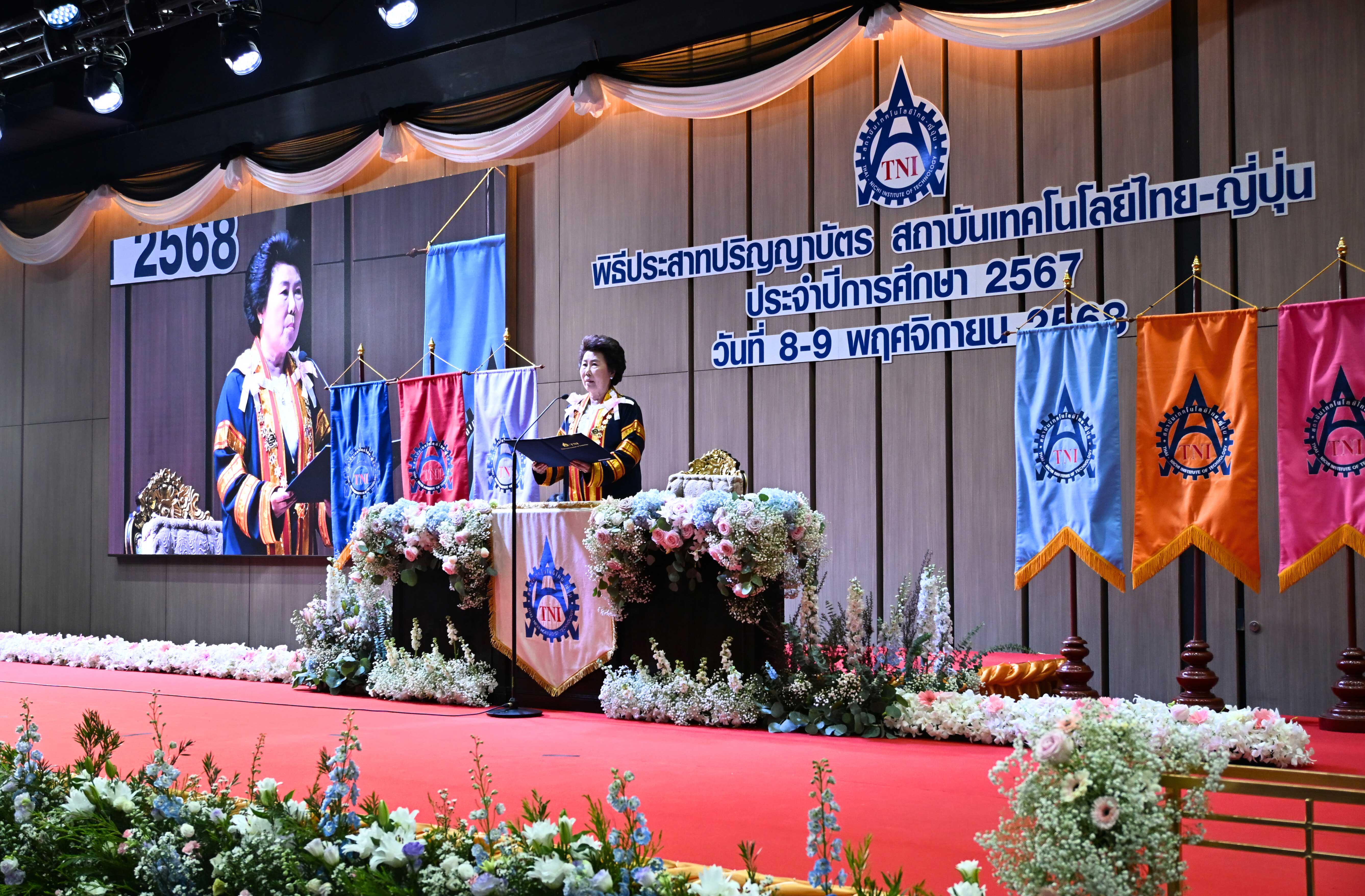 สถาบันเทคโนโลยีไทย-ญี่ปุ่น จัดพิธีประสาทปริญญาบัตรแก่ผู้สำเร็จการศึกษา ประจำปีการศึกษา 2567 เมื่อวันที่ 8-9 พฤศจิกายน 2568 ณ Convention Hall อาคาร E โดยมี รองศาสตราจารย์ปราณี จงสุจริตธรรม อุปนายกสภาสถาบันเทคโนโลยีไทย-ญี่ปุ่น และ นายกสมาคมส่งเสริมเทคโนโลยี (ไทย-ญี่ปุ่น) ให้เกียรติเป็นประธานในพิธี พร้อมกล่าวโอวาทแก่บัณฑิต โดยสรุปว่า วันนี้คือวันแห่งความภาคภูมิใจ ไม่เพียงแต่สำหรับตัวบัณฑิตเอง แต่ยังรวมถึงครอบครัว คณาจารย์ และผู้ที่มีส่วนสนับสนุนมาโดยตลอดระยะเวลาที่ศึกษาในรั้วสถาบันแห่งนี้ ซึ่งความสำเร็จดังกล่าวเกิดจากความมุ่งมั่น อดทน และความเพียรพยายามของบัณฑิต อย่างไรก็ตาม การสำเร็จการศึกษาและเข้ารับปริญญาบัตรในวันนี้ มิใช่จุดสิ้นสุดของการเรียนรู้ หากแต่เป็นก้าวแรกของการเดินทางบนเส้นทางวิชาชีพตามสาขาวิชาที่บัณฑิต ได้เรียนรู้มา ทั้งนี้ ยุคที่เทคโนโลยีและนวัตกรรมเปลี่ยนแปลงอย่างรวดเร็วและไม่หยุดอยู่เพียงสิ่งที่ได้เรียนมา บัณฑิตต้องแสวงหาความรู้ใหม่ และเปิดใจรับแนวคิดที่หลากหลาย พร้อมที่จะปรับตัวต่อการเปลี่ยนแปลงอยู่เสมอ ขอให้รักษาคุณค่าของความเป็น “บัณฑิต” แห่งสถาบันแห่งนี้ ที่มี ทั้งปัญญา ความรับผิดชอบ และจิตสำนึกต่อส่วนรวมไว้ให้มั่น ขอให้บัณฑิตทก้าวเดินต่อไปด้วยความมั่นใจในศักยภาพของตนเอง ใช้ความรู้ ความสามารถ ทักษะ และจรรยาบรรณแห่งวิชาชีพอย่างเต็มความสามารถ และเป็นกำลังสำคัญในการสร้างสรรค์ประโยชน์ ต่อสังคม ประเทศชาติ และโลกของเรา รวมทั้ง เป็นแรงบันดาลใจและเป็นแบบอย่างที่ดีให้กับคนรุ่นต่อ ๆ ไป ขอให้บัณฑิตมีหัวใจแห่งความกตัญญู รู้คุณต่อครอบครัว ครูบาอาจารย์ และองค์กรที่มอบโอกาสให้เติบโต เพราะ “ความกตัญญู” จะเป็นรากฐานที่มั่นคงของความสำเร็จและความสุขในชีวิต และจงอย่าหยุดเพียงแค่การเป็น “ผู้รับ” แต่จงเป็น “ผู้ให้” ที่พร้อมจะส่งต่อความรู้และโอกาสให้แก่ผู้อื่นในสังคมด้วย เมื่อบัณฑิตทำเช่นนั้นได้ ความสำเร็จของท่านจะไม่เพียงสร้างเกียรติแก่ตนเอง แต่ยังเป็นพลังสำคัญในการพัฒนาประเทศชาติให้ก้าวหน้ายิ่งขึ้น