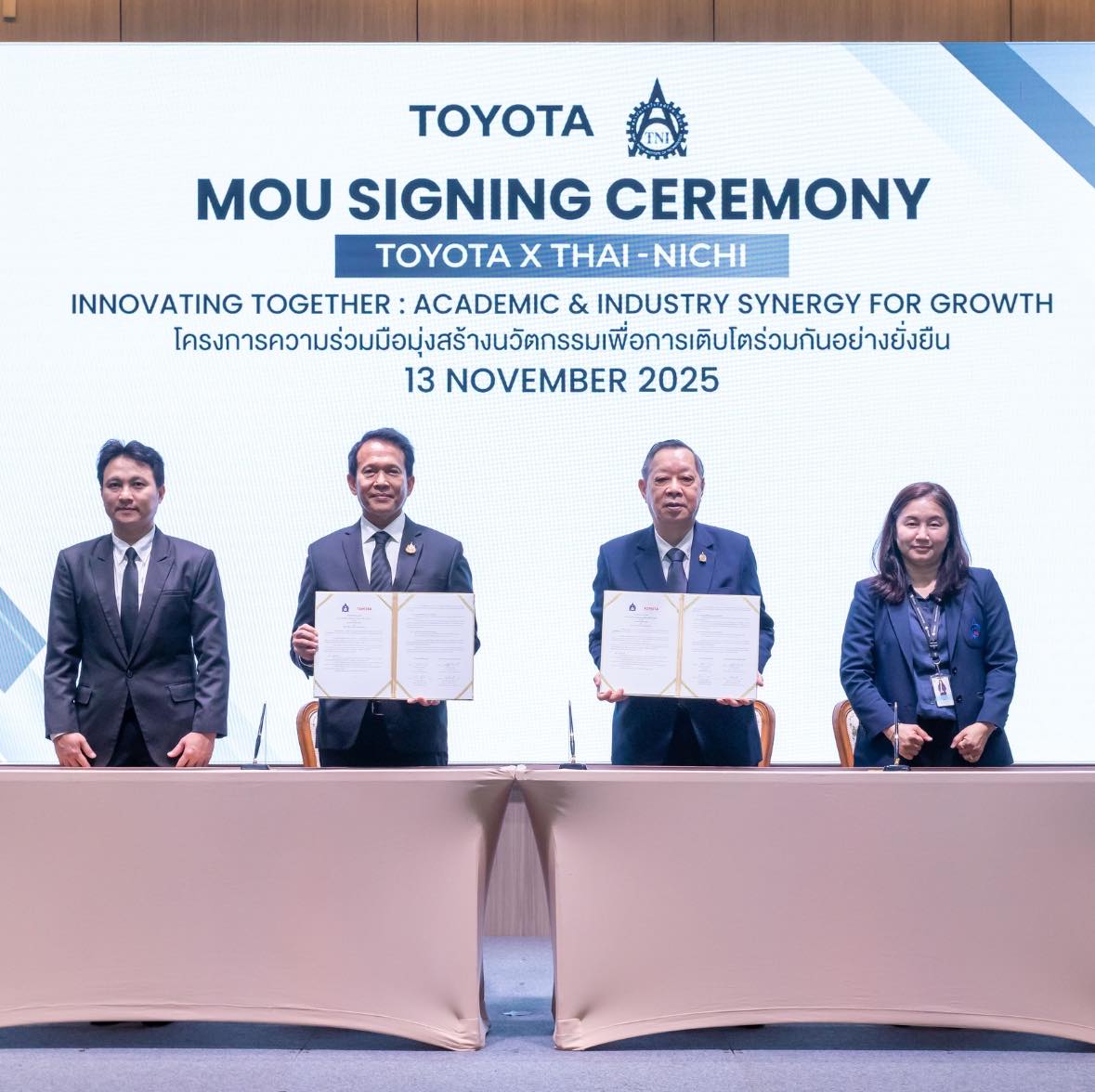 สถาบันเทคโนโลยีไทย-ญี่ปุ่น ร่วมกับ บริษัท โตโยต้า มอเตอร์ ประเทศไทย จำกัด ลงนามบันทึกข้อตกลงความร่วมมือทางการศึกษา (MOU) เพื่อส่งเสริมการเรียนรู้และการแลกเปลี่ยนองค์ความรู้ระหว่างภาคการศึกษาและภาคอุตสาหกรรม ภายใต้แนวคิด “Innovating Together: Academic & Industry Synergy for Growth โครงการความร่วมมือมุ่งสร้างนวัตกรรมเพื่อการเติบโตร่วมกันอย่างยั่งยืน"
