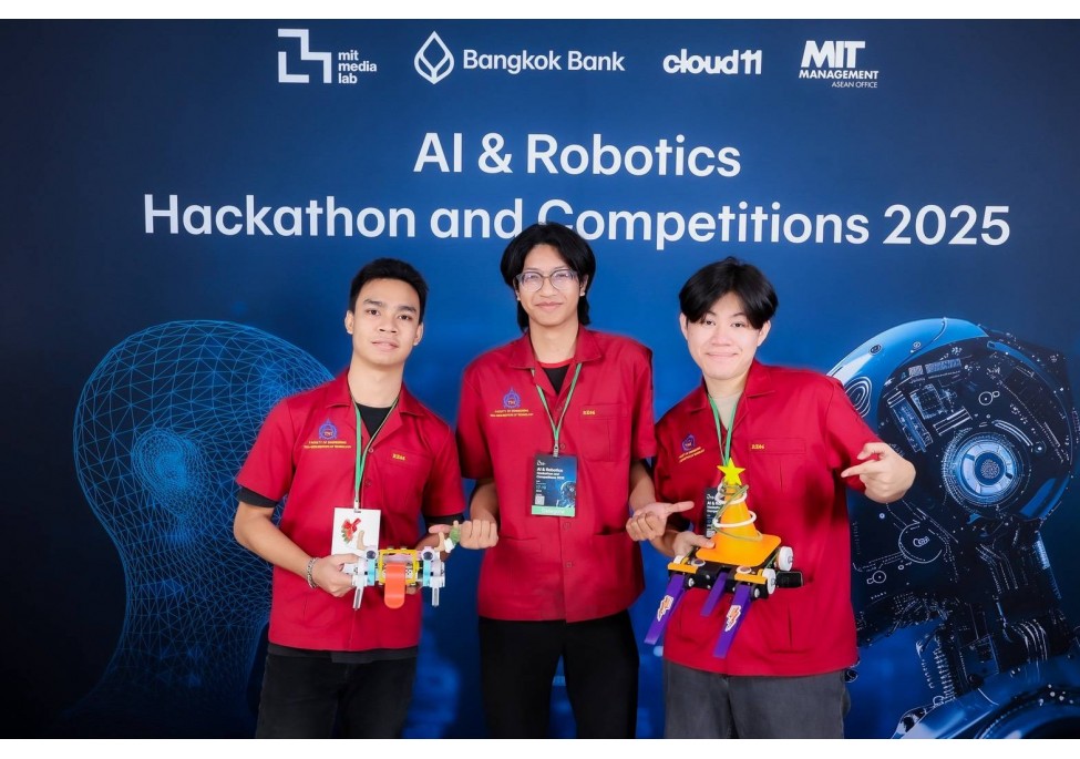 ขอแสดงความยินดีกับนายทัตเทพ สุวรรณขำ นายพีร์พูนพงศ์ บุญช่วย และนายวีระชัย ไชยยศ นักศึกษาสาขาวิศวกรรมหุ่นยนต์และระบบอัตโนมัติแบบลีน (RE) คณะวิศวกรรมศาสตร์ ที่สร้างชื่อเสียงให้กับสถาบัน ด้วยการคว้ารางวัลชนะเลิศการแข่งขัน Robot Battle Arena จากเวที AI & Robotics Hackathon and Competitions 2025 ซึ่งจัดขึ้นระหว่างวันที่ 17–19 ธันวาคม 2568 จัดโดย ธนาคารกรุงเทพ จำกัด (มหาชน) ร่วมกับ MIT Media Lab การแข่งขันดังกล่าวมุ่งเน้นการพัฒนาและประยุกต์ใช้เทคโนโลยีด้านปัญญาประดิษฐ์และหุ่นยนต์ เพื่อแก้ไขโจทย์ที่ท้าทายภายใต้สถานการณ์จริง เปิดโอกาสให้นักศึกษาได้แสดงศักยภาพด้านความคิดสร้างสรรค์ การทำงานเป็นทีม และทักษะการแก้ปัญหาเชิงวิศวกรรมอย่างเป็นระบบ